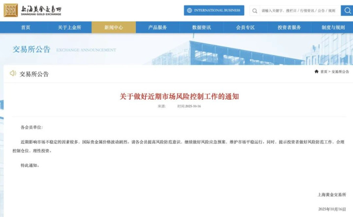 针对近期国际贵金属价格波动剧烈,上海黄金交易所10月16日向各会员单位发布关于做好近期市场风险控制工作的通知。